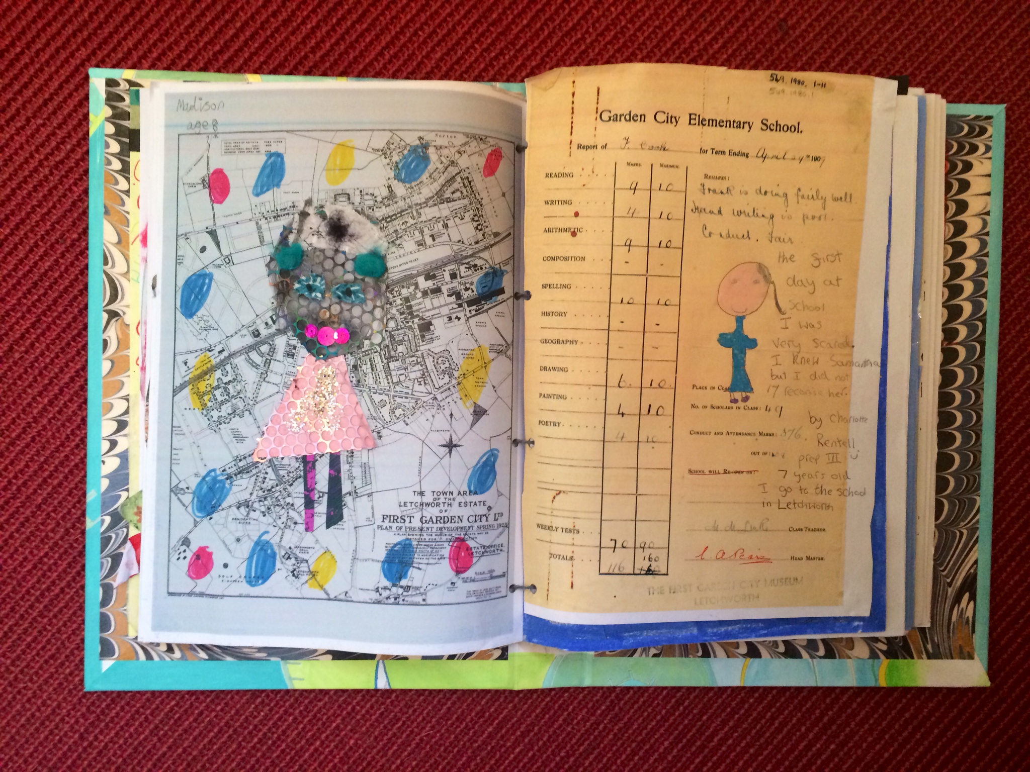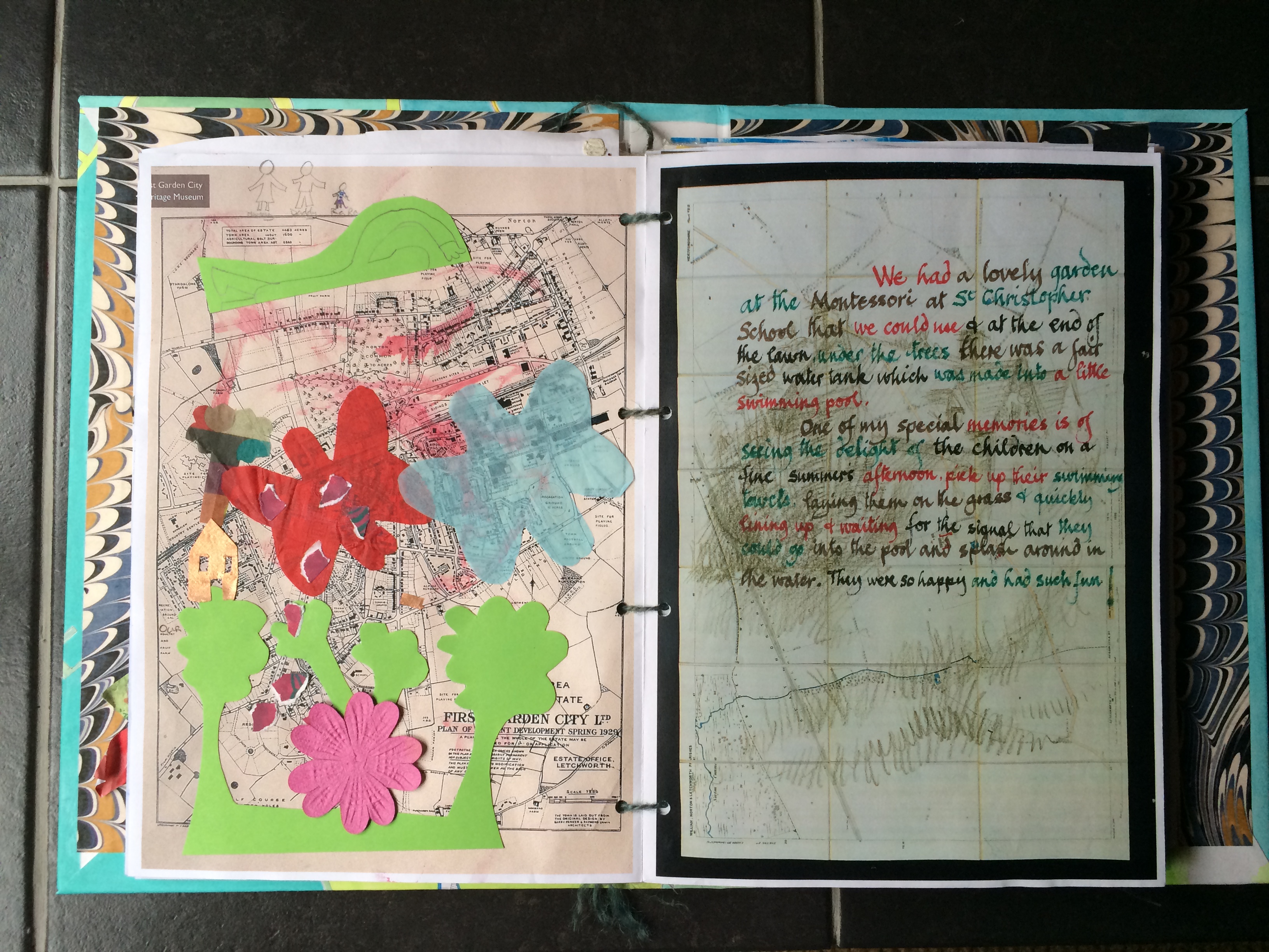 As part of Letchworth Heritage Foundations ‘Vision of Utopia’ project last month I held a series of workshops in Letchworth culminating in an all day drop in workshop in the town centre. Children and parents were invited to create a page for my book project where they could describe in text or image their favourite thing about Letchworth or something about themselves. They created their image/text on an image chosen from a selection of archive images of Letchworths past.