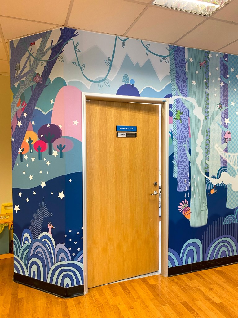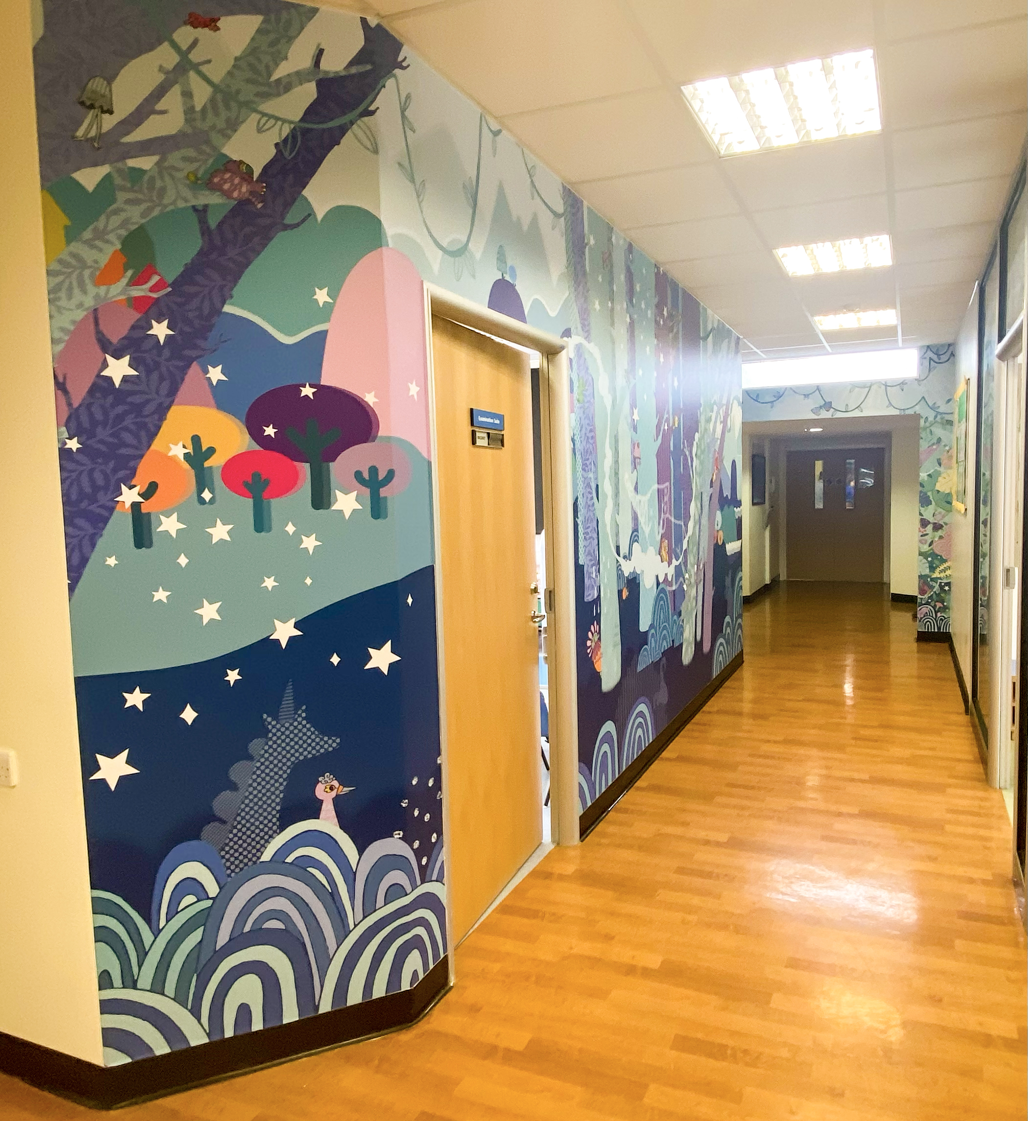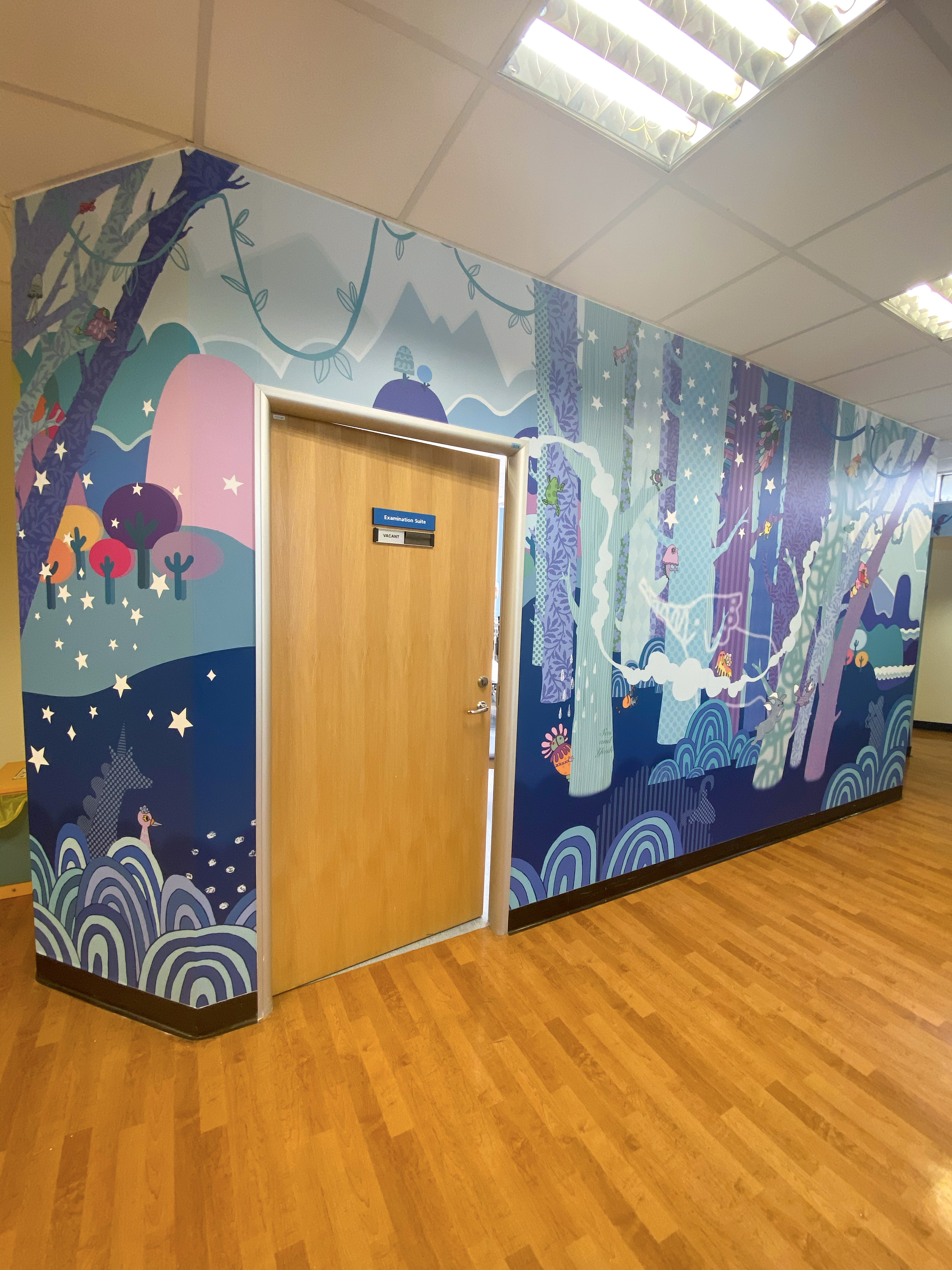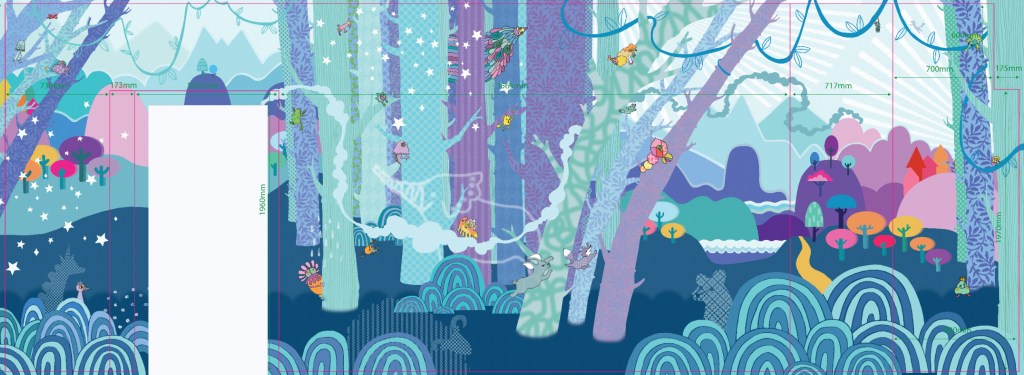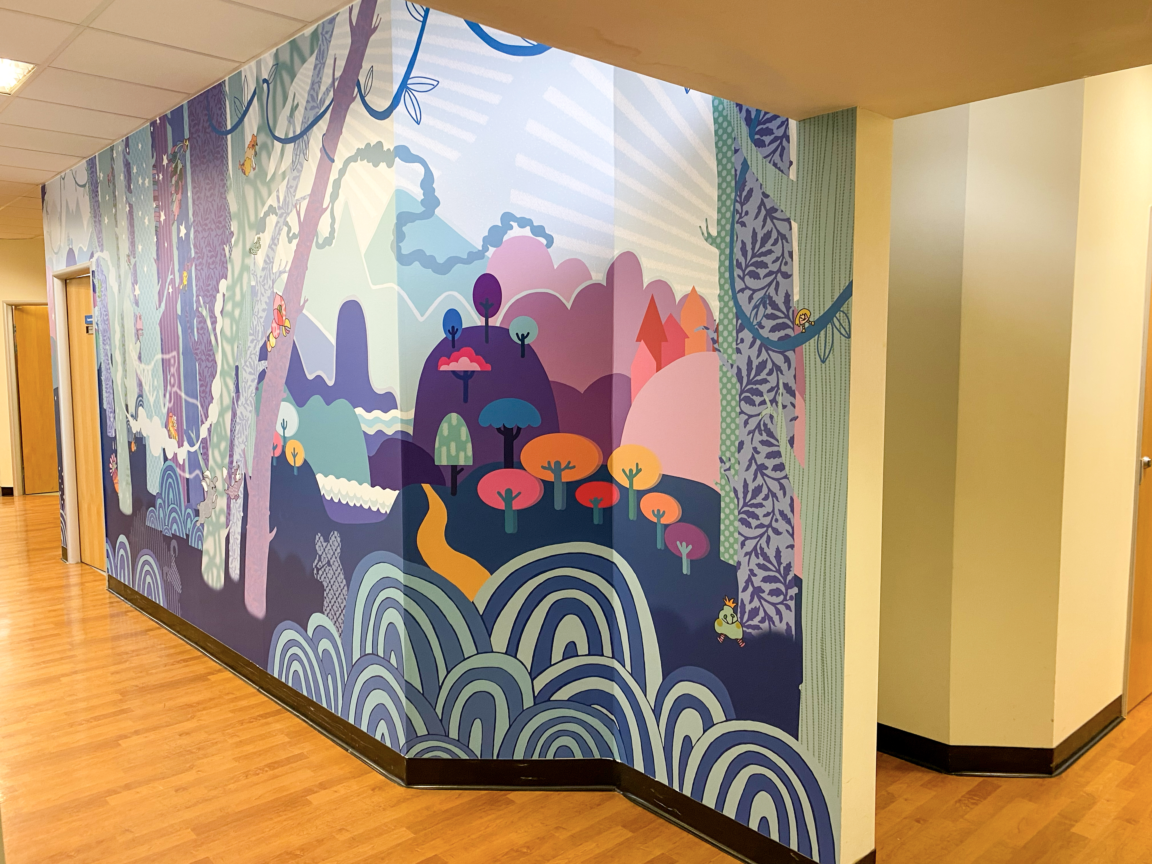 The client asked for something to delight both visiting children and staff, that was not too busy but still had plenty to capture the imagination. We created a dreamy landscape full of lavenders and purple to create a relaxing colour palette, and then filled the image with fantastical animals and wonderful friendly nature inspired beasties.