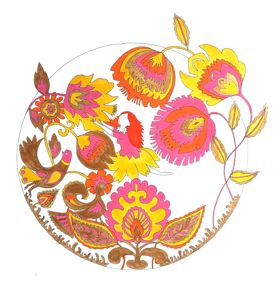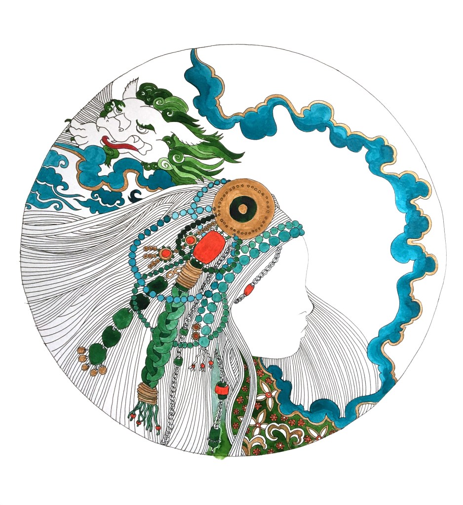 Cultural Goddesses showcased a series of work exploring imagined Goddesses, spirits and saints inspired by the artists travels and lifetime love of pattern, design and illustration. Image shown – ‘Siberian Mystic’ – Pen, inks, acrylics on Tinteretto hot pressed paper.
