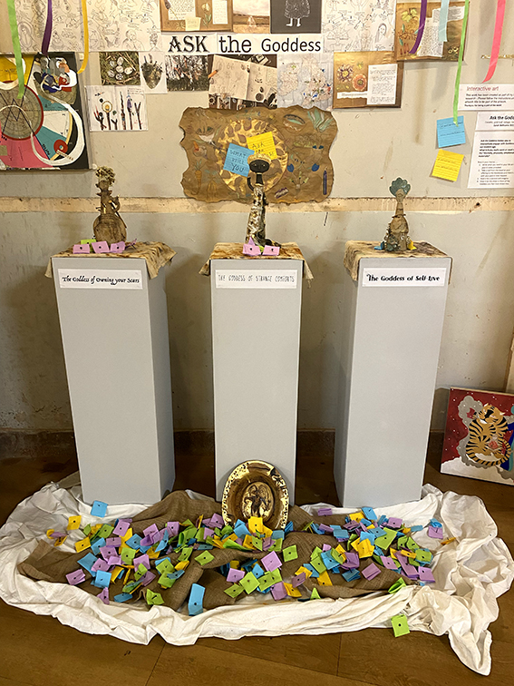 Ask the Goddess‘ invited the public visiting the gallery to connect with the artwork by making a wish and leaving a votive offering. The work aimed to explore how a diverse audience might interact with the shrine in a meaningful and personal way. Asking, “Can symbolic and engaged audience participation facilitate healing or emotional release?”.