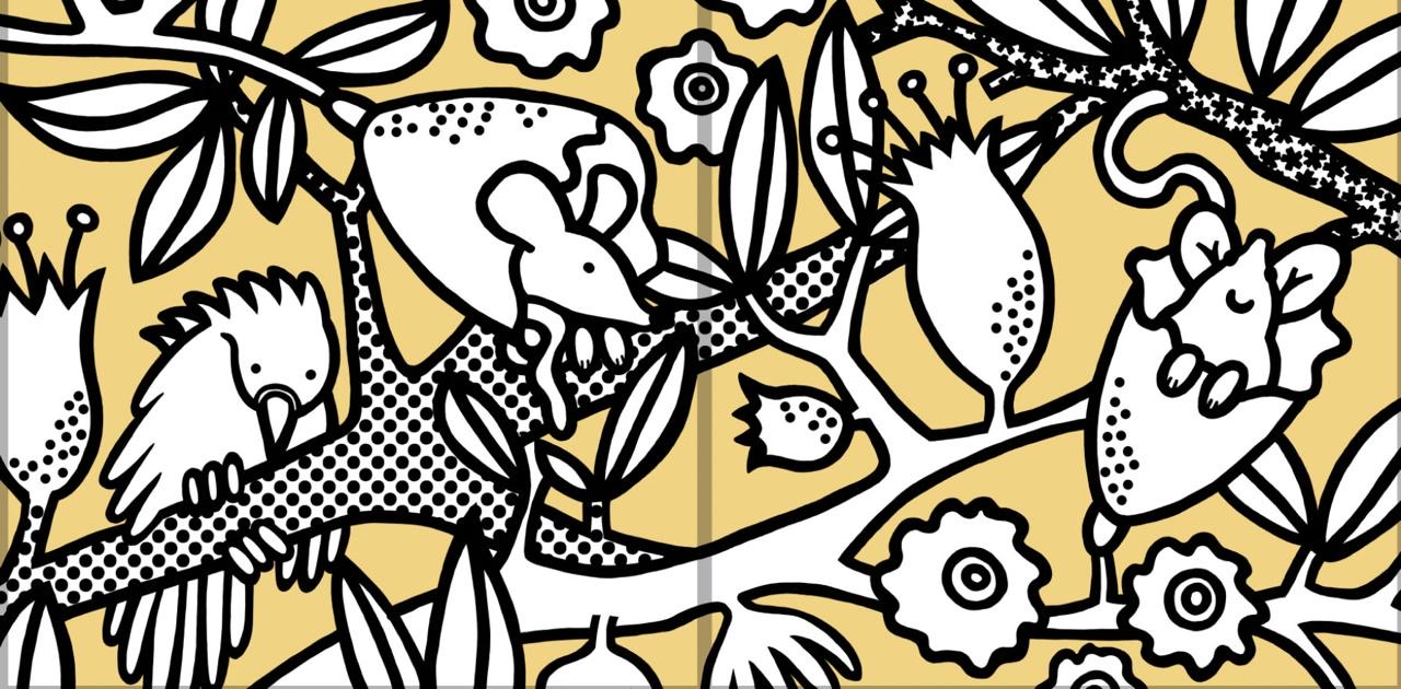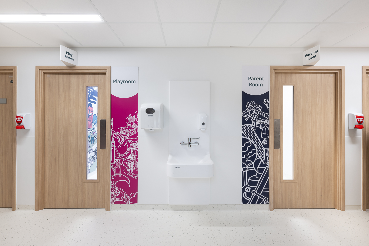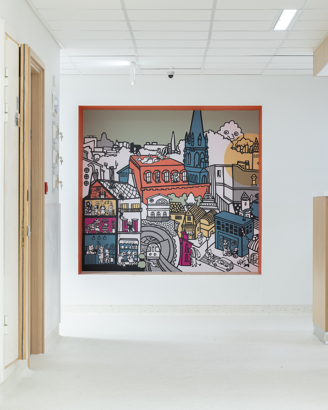 Murals and lightboxes in the cot bays were specifically created to resemble the black and white sensory patterns that aid babies’ development, and that they find easier to distinguish than colour, and our black and white designs with vivid pops of colour were also designed to emulate the work of fellow ward artist Jo Peel to lend a cohesive look to the different design elements within the ward. We hope that parents, staff and most importantly children will enjoy our magical version of London.