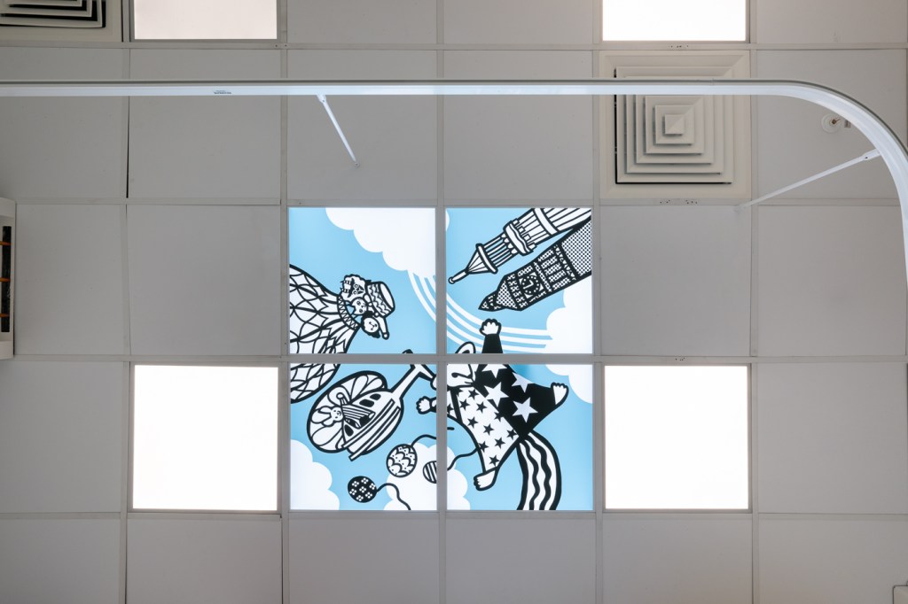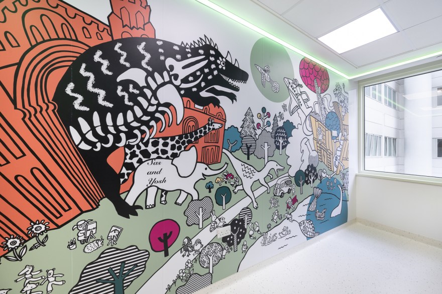 The artwork we created for the Reuben Young People’s Centre is all based around the idea of a day out sightseeing and shopping in Northwest London. Aimed at inspiring, uplifting and distracting the children who pass through the ward by giving them lots of vibrant and fun designs to look at and interact with, whether they are in for a stay, having a treatment or visiting a loved one.